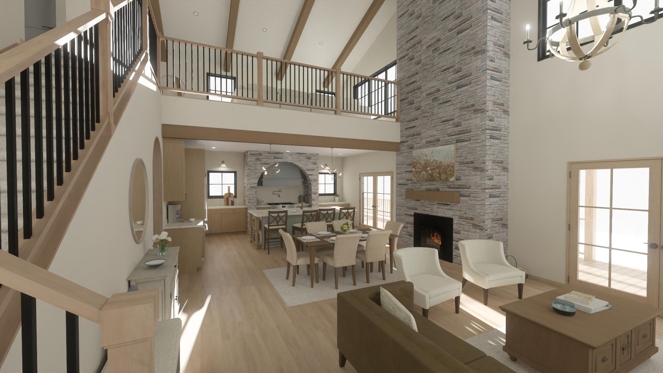 Step inside to a welcoming entry where the staircase opens to a loft overlooking the great room, connecting the living room and kitchen below. A stone archway over the oven makes a statement, while subtle touches like the hidden walk-in pantry seamlessly combine form and function.